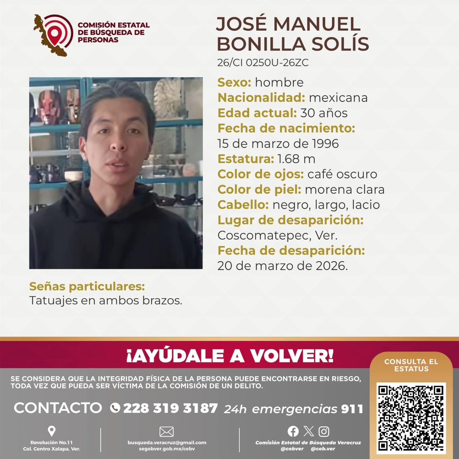 Coscomatepec, Ver.— La Comisión Estatal de Búsqueda de Personas del Estado de Veracruz activó una ficha de localización para dar con el paradero de José Manuel Bonilla Solís, quien fue reportado como desaparecido desde el pasado 20 de marzo del presente año en el municipio de Coscomatepec.
