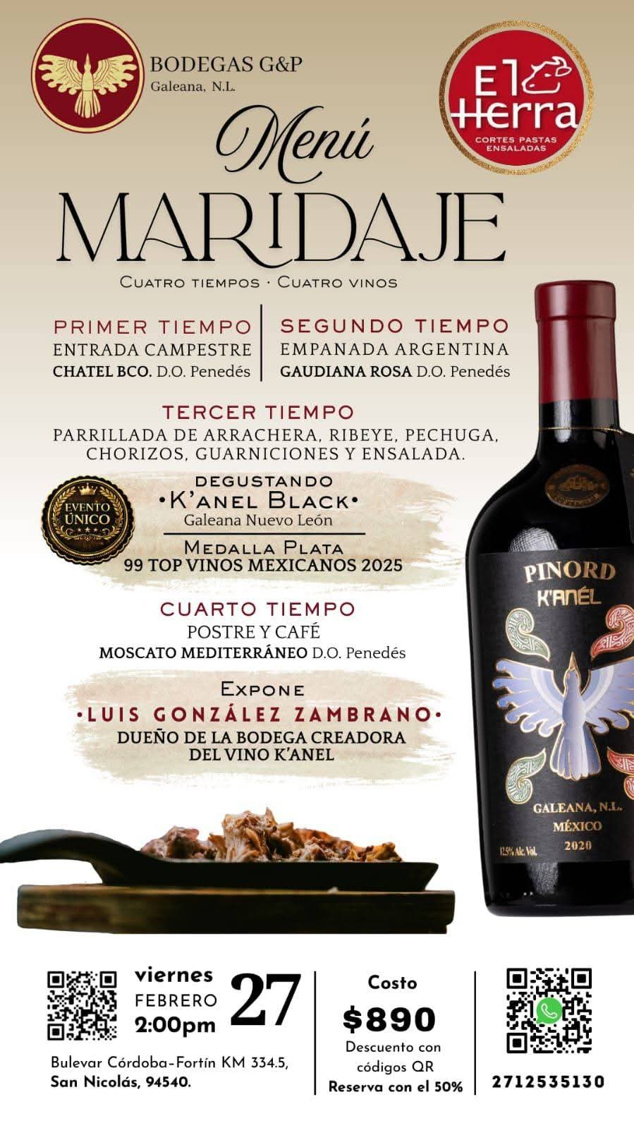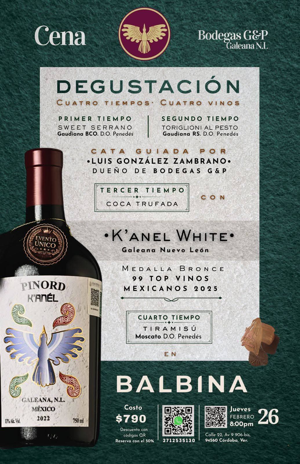 La experiencia contará con la participación de Bodegas G&P, ubicadas en la sierra de Galeana, Nuevo León, productoras de las etiquetas K’Anél Black Label y K’Anél White Label, vinos que han sido reconocidos por su calidad en el certamen Top 99 Vinos Mexicanos 2025 organizado por la Revista CAVA.