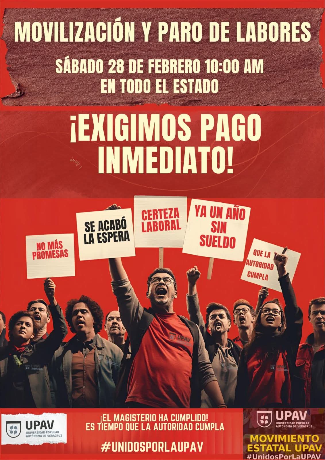 El Movimiento Estatal de Docentes y Directores de la Universidad Popular Autónoma de Veracruz (UPAV) informó que este viernes 27 de febrero vence el plazo otorgado al Gobierno del Estado para que inicie la dispersión de los recursos correspondientes a pagos pendientes desde 2025.